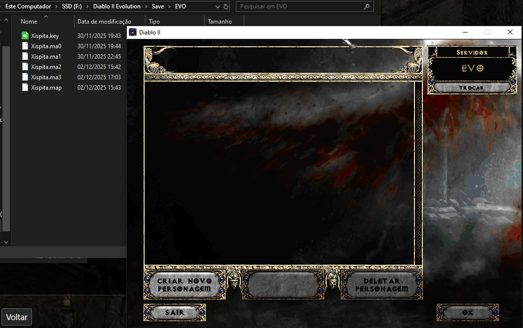 Após a nova atualização, meu save não consegue mais ser acessado no menu de personagens. Mesmo tendo os arquivos do meu personagem no computador (com exceção do .ds2 que é retido nos servidores), meu personagem simplesmente não aparece mais na tela de seleção, como se ele tivesse sido apagado dos servidores do Diablo 2 Evolution. Gostaria de saber se seria possível recuperar meu personagem.